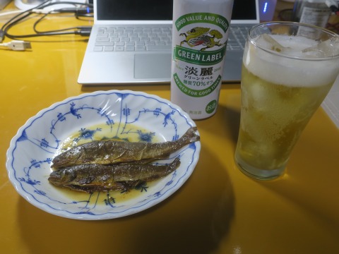 22:11 おまけ 社宅に帰着して、風呂に入って、寝る前にちょっと水分補給。 お腹の具合はもう大丈夫。のハズ。(笑) 自分土産に買ってきたイワナの甘露煮を肴に発泡酒をいただきます。 |