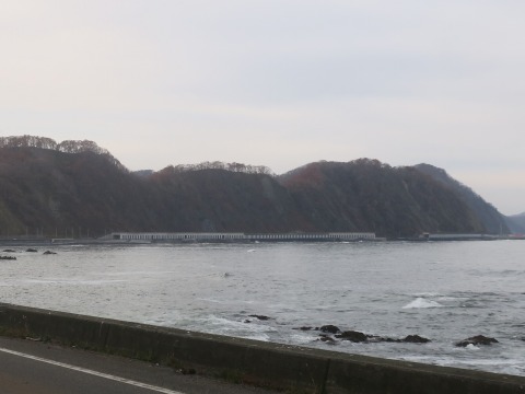 14:30 延々と続く覆道 往路を逆から走ると、また景色が違って見えます。 海岸線近くの白い構造物は覆道。 延々と続いているのがわかります。 海岸線近くまで急崖が迫っているため、土砂崩れや雪崩などから道路を保護するための構造物ですが、自分が走っている頭上で土砂崩れが起こっているとしたら、気持ちの良いものではありませんね。 |
