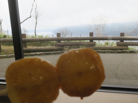 11:21 摩周いもだんご お昼も近くなりお腹が空いてきました。 けど、休憩舎の中にはちゃんとお昼を食べるほどのメニューが無かったので、いもだんごを食す。 茹でたジャガイモを練って餅みたいに粘りを出したものに、みたらし風のタレで味付けをしたもの。 味は想像してもらえば、それほど遠くないと思います。(笑) |