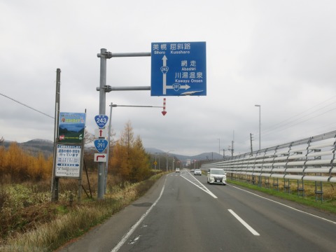 11:47 国道391号線へ 重複区間をちょこっとだけ走ると国道243号線との重複区間が終了。 この交差点を右折して国道391号線の単独区間で川湯温泉・網走方面に進みます。 |