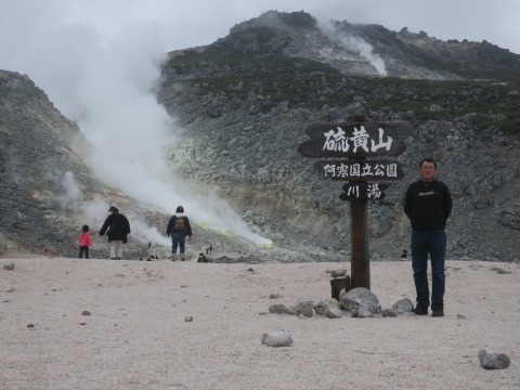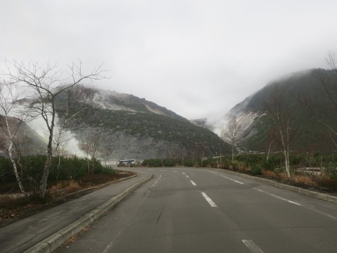12:02 蒸気を上げる 道道を折れて硫黄山の駐車場に向かいます。 目の前にもうもうと蒸気を上げる硫黄山が見えます。 |