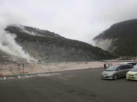 12:03 クルマを駐めて 硫黄山の駐車場に到着。 クルマを駐めます。 無料でした。(有料とのネット情報もあるので、季節的なものかも) 噴煙が近いですね。 |