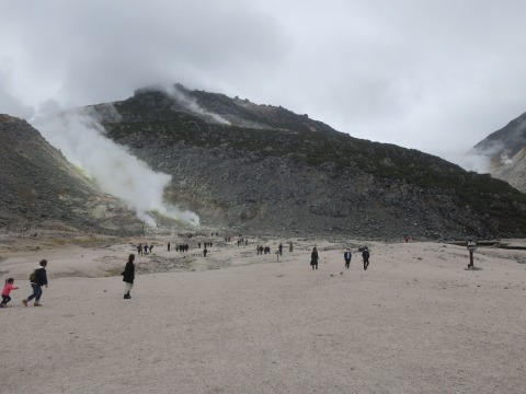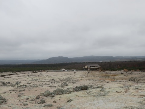 12:15 荒涼と 硫黄山の周辺は、火山性の酸性ガスによって草木が生えず荒涼としています。 写真中央がクルマを駐めている駐車場とレストハウス。 それでは駐車場に戻ります。 |
