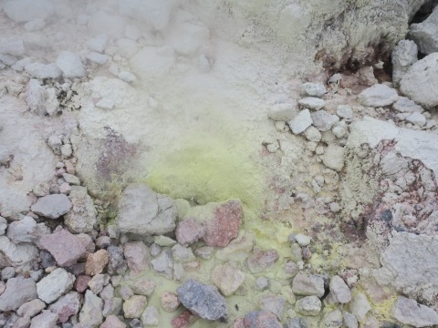 12:12 噴気孔は せっかくなので、噴気孔までいってみた。 「硫黄臭い。」(笑) 黄色く付着しているのは硫黄らしい。 明治時代の初期、硫黄山は火薬やマッチの原料として硫黄の採掘が積極的に行われたそうな。 物資輸送のため、北海道で2番目に早く鉄道が建設されたそうです。 |