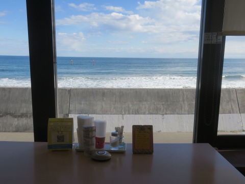 12:20 席からは 入店して先客があり、ちょっと待って席に案内されました。 窓際の席からは、太平洋が広がっています。 天気が良くて気持ちの良い景色です。 お店の雰囲気はおじさん4人組には似つかわしい。(笑) さて、何を食べましょう。 |