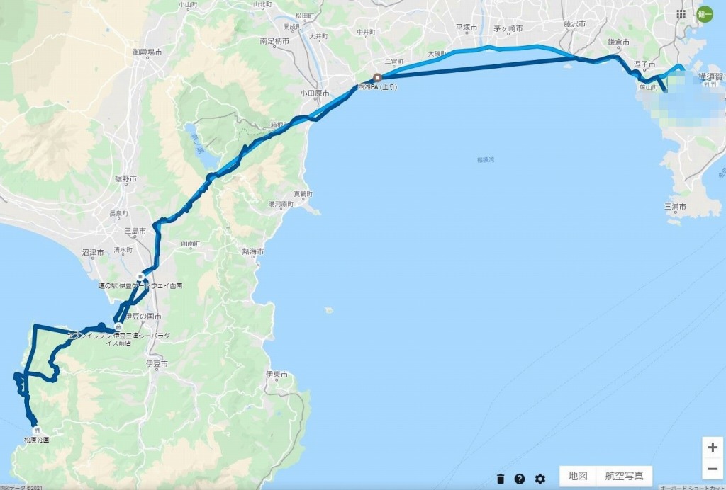 | 今日の道程:土肥〜大瀬崎〜箱根〜自宅(横須賀) : google map のタイムラインより | |