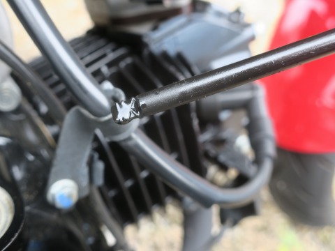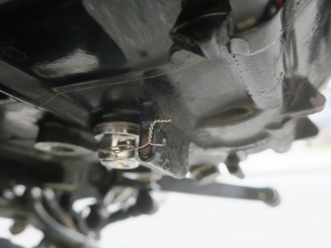 11:21 ついでにフィラー キャップも ついでにオイルのフィラーキャップにも穴を開けて、ワイヤーロック。 エンジン側に適当な穴が無かったので、クラッチワイヤーを固定しているブラケットに取付け。 ちょっと格好悪い。(笑) |