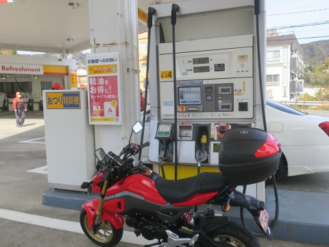10:52 ガソリンを給油 細野高原で景色を楽しんだ後、山を下りて、国道135号線に戻ってきました。 ここでガソリンを給油。 GROM だと自宅から稲取温泉まで、無給油で往復できるかなぁ〜。って微妙な距離。 なので、安全パイを握って、ガソリンいれておきます。 入ったのは 2.6リットル。 燃料タンクの容量が 5.7リットルなので、無給油で往復できそう。 でも、往復したら残り 0.5 リットル→500ccって言うのもね。 心細い。(笑) |