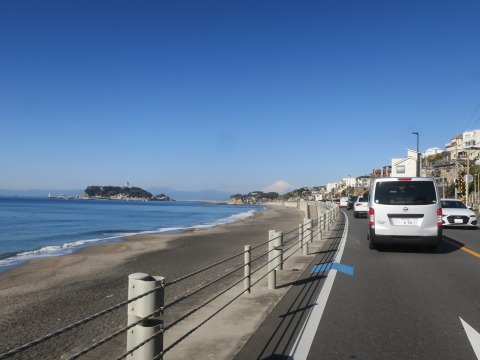 9:06 走りやすくなりました 逗子海岸から国道134号線を西走し由比ヶ浜、稲村ヶ崎を過ぎて七里ヶ浜までやってきました。 七里ヶ浜のこの辺りは2019年10月の台風19号の波浪により道路の擁壁が被害を受け補修工事中でした。 けど、工事終わったね。 工事中は道路幅が狭くて走りづらかったですけど、元の幅員になり走りやすくなりました。 左前方には江ノ島、その右手にはうっすら富士山が見えています。 |