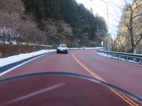 10:15 箱根新道を 箱根新道に入り箱根峠に向けて標高を上げていきます。 箱根新道は寒いのよ。 北側斜面になるんでね、日当たりが悪いんです。 道路の脇には雪が残っています。 目の前にはペースカー。 その前はガラガラです。 で、この赤い舗装が嫌いです。 確かによくグリップするんですが、乾いているか、濡れているかが見た感じわかり難いです。 乾いていると思って走っていて、濡れてたりしたら、ビビるじゃん。(笑) |