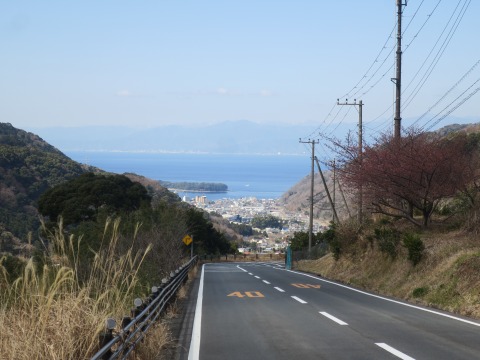 11:21 戸田に下る 口野放水路の交差点からは、県道17号沼津土肥線で駿河湾に沿って西浦古宇まで西走。 その後、右折して山側に入り県道127号船原西浦高原線に入り県道18号修善寺戸田線に突き当たるまで南下。 突き当たって右折して県道18号線に入り戸田港を目指して、今度は西走します。 眼下に見えるのは戸田の市街地、その先左手からにゅっと海から生えている様に突き出した岬は砂州で形成された”御浜岬”です。 この区間は交通量も少ないワインディングロードが主体で、バイクで走っていてライディングを楽しめる路線です。 |