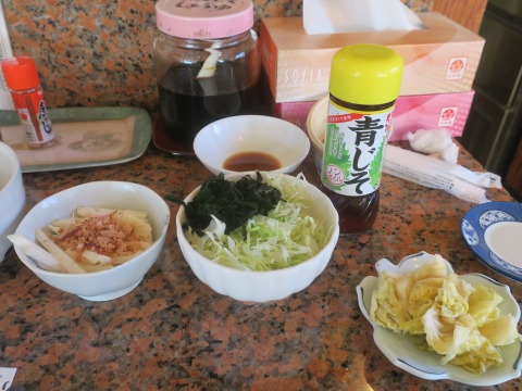 左から山芋の千切り、サラダ(ワカメとキャベツの千切り)に白菜の甘酢漬け。だったかな。