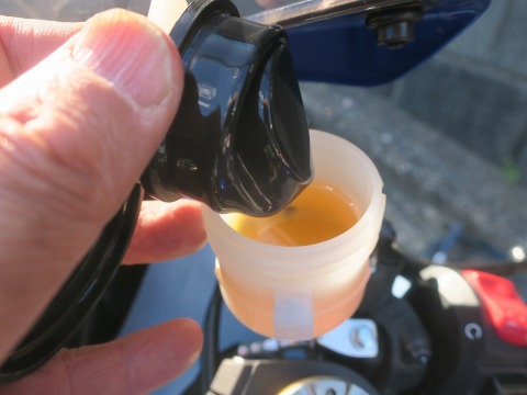 15:27 リザーバータンクから リザーバータンクのキャップを開けて。 やっぱり、新品に比べると色が濃いですね。 まずはリザーバータンク内の不要なブレーキフルードを抜いて、新しいフルードを入れてから、エアー抜きをしながら、フルードを入れ替えていきます。 |