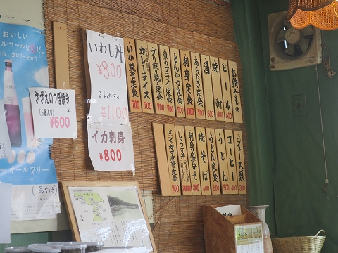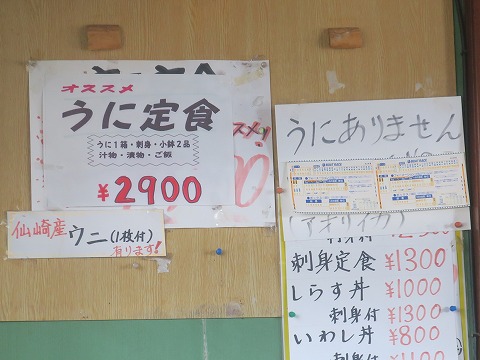 壁のお品書きが気になる 注文した後、壁に貼ってあるお品書きの”さざえのつぼ焼き(5個入り)¥500が気になっていたのよね。 ¥500は安いよね。 「5個くらいなら食べられるかな。」 なんせ、朝食は菓子パン1個だったからね。 と、うに を食べつつ追加するか悩みます。(笑) |