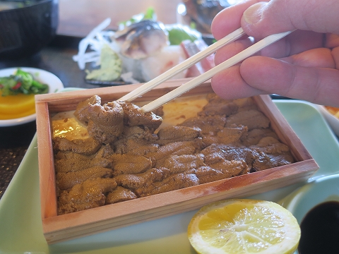 11:45 うには うには1箱。 他のおかずもたっぷりあるので、1つずつ。 なんて、ちまちましたことはしません。 箸でざっくり。 北海道や青森で食べている様な鮮度抜群で真っ黄色じゃなくて、色が悪いけど、”うに”は”うに”だ。 |