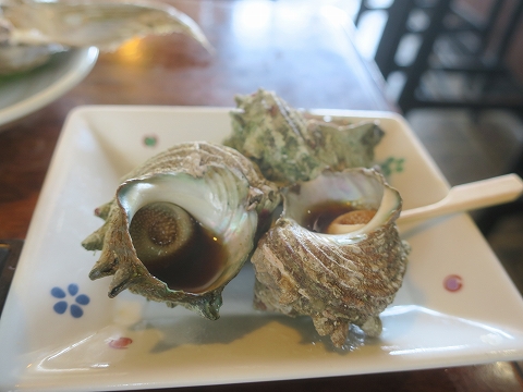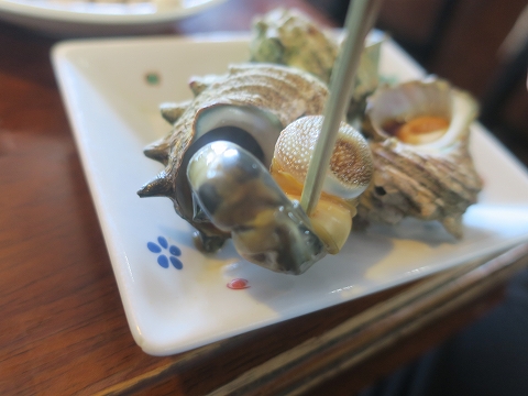 11:52 さざえを食す ここでさざえのつぼ焼きいただきましょう。 出てきた直後は、熱くて触れないくらいグツグツしてましたから。 さざえのつぼ焼きなんかも久しぶりに食べます。 伊豆辺りでも、結構いいお値段しますからねぇ、なかなか手が出ません。 さざえは小ぶりということもあって、肝の苦みも少なめ。 美味しくいただけました。 |