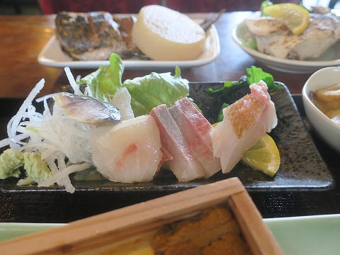 11:45 うに定食 ちょっと待って、うに定食が運ばれてきました。 壁に張ってあるお品書きを見ると、”うに1箱、刺身、小鉢2品、汁物、漬物、ご飯”とあります。 小鉢の数を数えると、3品。 それにプラス、サービスで煮魚も付いてきました。 「おっ、お得!」 (^o^) それでは、さっそくいただきましょう。 |