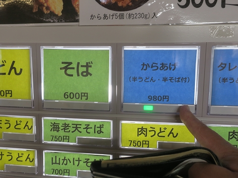 12:56 注文は 注文は先に食券を買うスタイル。 そう、ここは大分県の中津市ですから名物の鶏のからあげを食べておきましょう。 からあげに半うどんorそば付きの食券を買います。 店内はゴールデンウィークと言うことで、結構混んでます。 お一人様の自分は、食券を買ったら、空いた席に滑り込んで、料理が出来るのを待ちます。 |