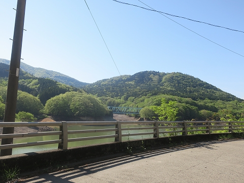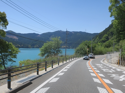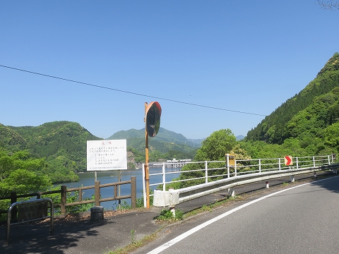 8:46 深見ダム湖 県道679号線に入るとすぐに現れるのは深見ダム。 県道はダムの堤体の上を走ります。 ダムの堤体を過ぎると、左手に深見ダムによってせき止められた深見ダム湖を見ることができます。 向こうに見えるトラス橋は、さっき走って来た県道50号線になります。 |
