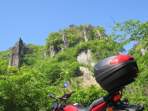 9:23 耶馬溪に近づく GROMを先に進めます。 道路の右側には岩の壁が迫り、左手には山移川(やまうつりがわ)に沿って県道は走る様になります。 GROMは深耶馬溪へと入っていきます。 この先県道は、山移川を縫うように走ります。 |