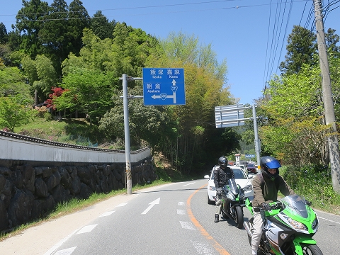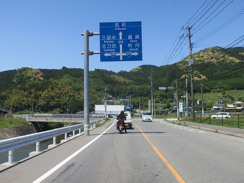11:30 緩い線形で 渋滞を抜けて、引き続き国道500号線を西走中。 昨日とおった小石川原ダムを過ぎて、その下流にある江川ダムによって造られた上秋月湖の湖畔を走ります。 緩い線形でゆっくりと標高を下げながら秋月城跡のある秋月の市街地に向かいます。 |