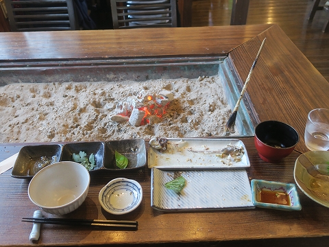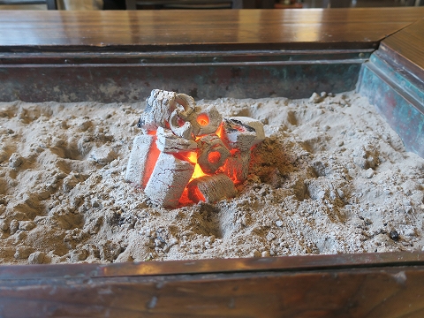 12:01 囲炉裏のテーブル 囲炉裏のあるテーブル席に移動。 4人がけのテーブルを一人で独占すると恐縮してしまいます。 ( ̄。 ̄;) 新型コロナウイルス感染症の流行以前であれば、相席とかもあったんでしょうが、今はね。 お店の人も勧めないですよね。 |
