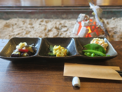 12:09 前菜から 山女魚が焼けるのを待っていると、しばらくして他の料理が運ばれてきました。 まずは、お品書きにあった”前菜三種盛り”。 どれも出汁がしっかりしていて美味しい。 日本酒が飲みたくなります。(笑) |
