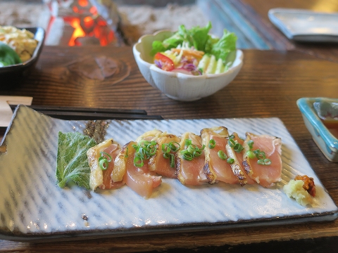 12:09 古処鶏(こしょどり) 続いて、古処鶏とサラダ。 古処鶏はたたきで。 古処鶏はこの辺り朝倉市のブランド鶏らしく、朝倉市と嘉麻市(かま し)との市境にある古処山(こしょ さん)を名前の由来にしている様です。 九州は、鶏の刺身をよく食べますよね。 自分も嫌いじゃありません。 と言うよりも、好み。(^_^) これも、お酒がのみたくなります。 これは焼酎かな。(笑) |
