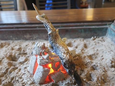 12:12 返す 山女魚の返し時がわからず、じーっと眺めていると、お店の人がひっくり返してくれました。 焼いてた面は いい具合に火が入ってますね。 |