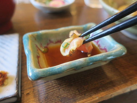 12:12 先に そしてご飯とみそ汁。 山女魚が焼けるまで もう少しかかりますので、先に古処鶏のたたきをおかずに食事を始めましょう。 |
