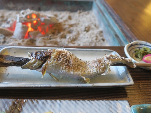 12:17 山女魚いただき 『山女魚、食べられますよ〜。』と店員さん。 いい具合に焼けました。 熱々の内に・・・・、と思ったら、熱すぎて食べられません。(笑) ちょっと置いてから、いただきます。 山女魚うまっ! 山女魚は海に下らないサケ科サケ目の淡水魚で、鮭ほど脂が乗っていることはなくて、川魚ならではの淡白な味わい。 九州だからヤマメじゃなくてアマゴかと思ったら、筑後川水系の小石原川流域のこの地域はヤマメの生息域みたいですね。(当然、天然じゃありませんが) |