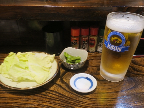 19:10 カウンター席で 訪れたお店は”かっ鳥”。 のれんには”かつ鳥”とあるけど、電飾看板には”かっ鳥”と小さい”っ”。 どっちが正解かは、知らない。(笑) 店内に入るとノーゲスト。 さっきのお店と正反対。 (^_^;) 左手がカウンター、奥にテーブル席がありました。 お一人様なので、カウンターに座ります。 まずは、ビールからスタート。 突き出しは、キャベツと枝豆。 お品書きは、焼き鳥とおでん。 他は無かったかな。 |