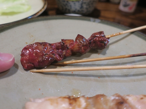 19:22 サイズ感 一串をふた口くらいで食べられてしまうので、3本は6口で終わり。 大食漢気味の自分的には、もの足らないですぅ。 つまみをほとんど食べなくて、飲むのがメインの人にはこれくらいの量が良いのかもしれませんが。 続いて、レバー。 これはタレで。 大きさがわからないと思ったので、指を写し込んでみました。 人差し指と同じくらいのサイズ感。 味は悪くないんですけどねぇ~。 |