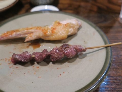 19:20 手始めに 初めてのお店だと焼き鳥1本がどれ位の量なのかわからないので、とりあえず”身とバラと皮”の3本を注文。 それにたくさん頼んで、冷めちゃうと美味しくないし。 しばらくして、3本運ばれてきました。 「ちっちゃ!」 ネットのカキコミの通り、小っちゃいです。 かなり小っちゃいです。 値段は安いんですけどね・・・・・。 (ーー;) それでは、いただきましょう。 小さくて物足りません。(個人的な意見です) 2切れくらい口に放り込んでも、少なくて味が広がりませんね。 |