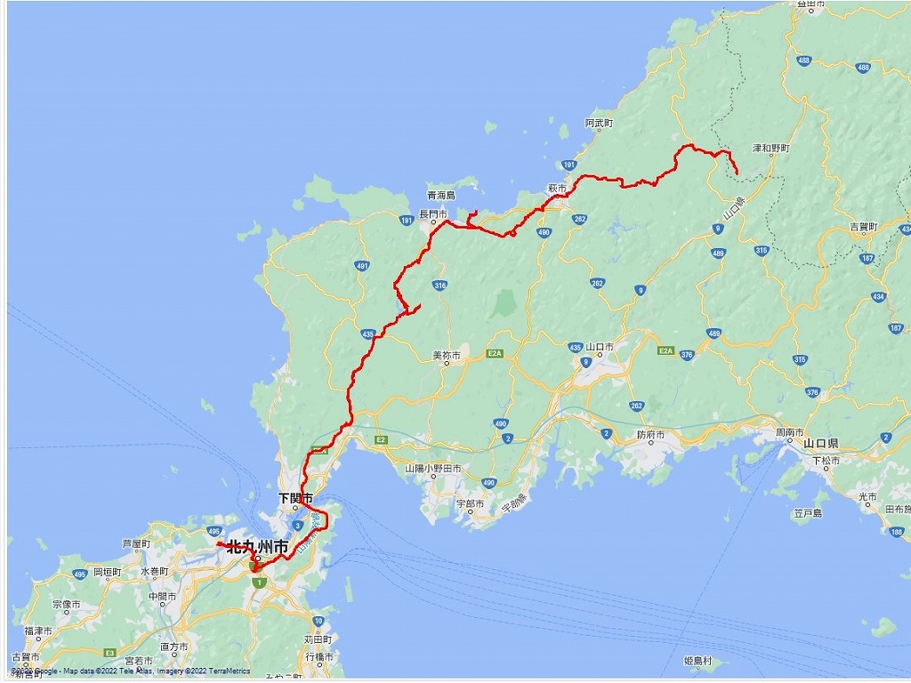 | 午前中の道程:北九州市~小月~長門~萩~津和野:181.49km | |