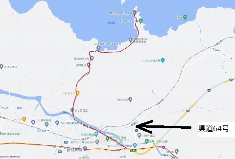県道64号萩三隅線(はぎ みすみ せん)は 萩の市街地まで国道191号線の海側を走る県道です。 国道191号線より楽しそう。 国道191号線はそこそこ交通量もあるし、3桁と言えども国道ですからね。 迷惑をかけないよう、だれも走っていないような県道を走りたかったわけです。 |