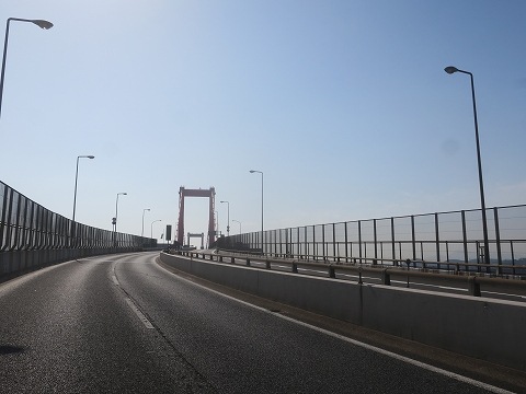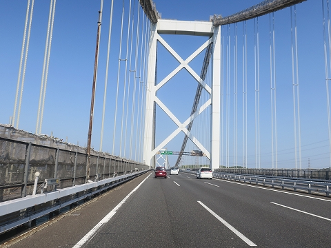 9:21 関門橋を渡る めかりPAで写真を撮った後、関門橋を渡ります。 高い! 苦手です。 (-_-;) よく通ることがある横浜ベイブリッジの橋げた高さは海面から55mに対して、関門橋は61mとあまり変わらないんだけど、関門橋の方がより高く感じます。 |