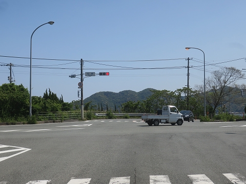 10:42 仙崎で国道191号線へ 県道34号線を北上して仙崎の交差点で国道191号線に突き当たりました。 この交差点を左折して、今度は萩方面を目指します。 |