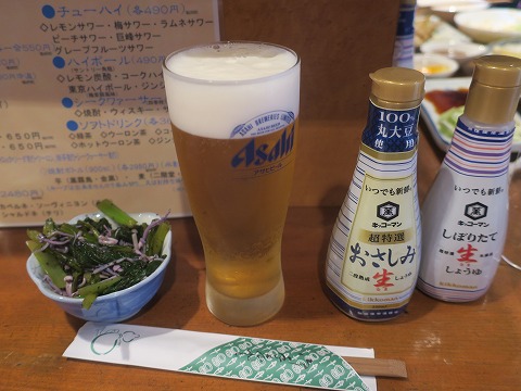18:06 お通しは ビールと一緒に今日されたのは、小松菜(たぶん)とエノキのゴマ和えっぽいもの。 ボリュームあります。(笑) 普段メニューにあったとして頼まないようなものがお通しで出てくるのは嬉しい。 ゴマ和えとかって、食べると美味しいけど、自分一人だとなかなか注文しないですね。 |
