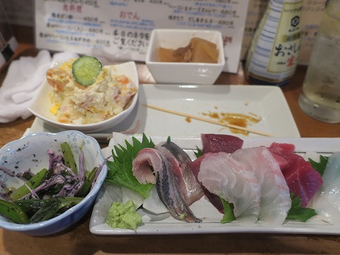 18:22 頼んだのは 頼んだのは、”お刺身ちょい盛り”、と”季節の煮物等2種盛り”。 刺し盛りはお一人様向けに4~5種類のお刺身を2、3切れずつ盛ったもの。 これで、確か800円くらいだったから、とってもお財布に優しい。 お刺身もマグロは赤身だけど本マグロかインドマグロで美味しいです。 2種盛りは、カウンターの上の大皿から”ポテサラ”と”ダイコンと何かを煮たもの”を頼みました。 これも600円くらいなので、1つあたり300円とお得。 ポテサラもイモ感があって美味しいです。 このあとも、ビール飲んだり、サワー呑んだり、追加で料理を頼んだりと、結構飲み食いしましたけど、隣に座った人と話し込んじゃって、他の料理の写真はありません。 (ーー;) |