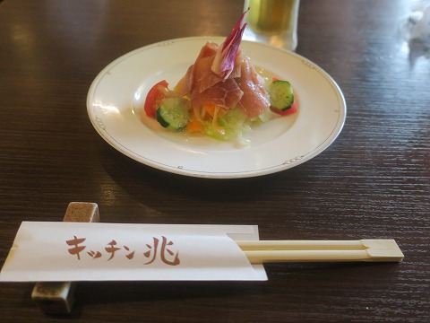 17:52 生ハムとキャベツのマリネ しばらくして運ばれてきたのは、セットの”生ハムとキャベツのマリネ”。 酸味のあるマリネ汁は清涼感があります。 夏の暑さの中、エアコンの効いた部屋で、冷たいビールとよく合います。 |