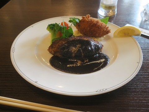 18:01 スペシャル セット しばらく待って、スペシャルセットのメインが運ばれてきました。 セットには、赤だしとライスが付きますが、ビールを飲んでいるので、後からにしてもらいました。 スペシャルセットは、デミグラス ソースのハンバーグ。 フライはコロッケで洋食屋さんの王道、カニクリーム。 それに温野菜のブロッコリーとキャロット グラッセが添えられています。 お洒落。 (^_^) |