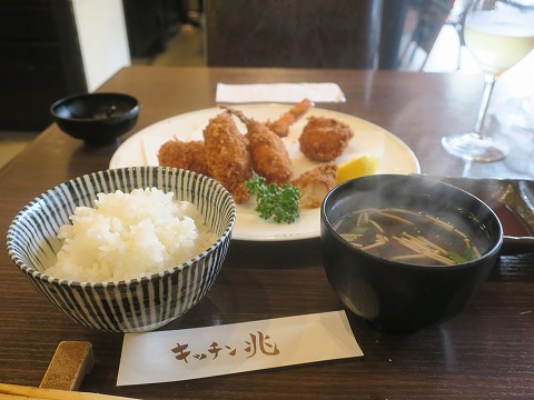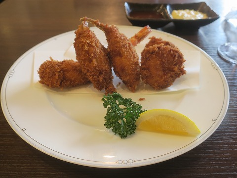 18:20 海の幸フライ セット 追加で注文。(笑) 海の幸フライセットを単品で。 セットは、エビフライ、カニのツメ、ホタテ貝柱。 最初から、追加注文することを見込んで、ライスと赤だしは後にしてもらったんです。(笑) |