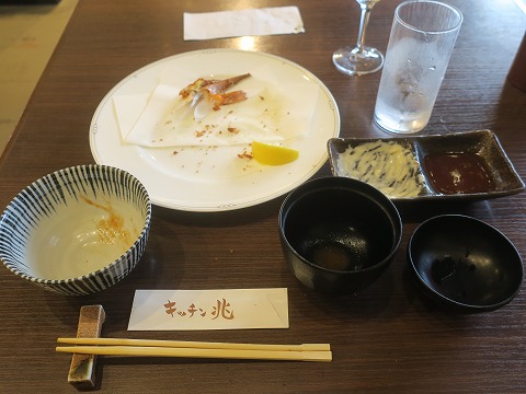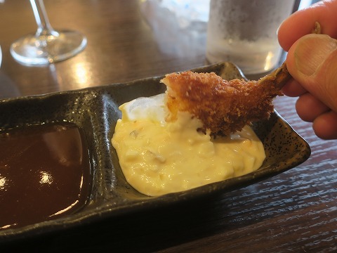 18:23 タルタル カニのツメのフライにはタルタル ソースをたっぷり付けて。 このタルタル ソース、うまうまです。 後で聞いたら、マヨネーズも自家製だそうで、ソースのタマゴ感が凄いです。 |