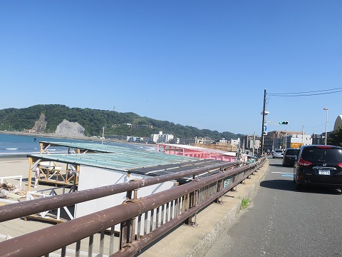 8:27 海の家 県道27号線沿いのアポロ ステーションでガソリンを給油した後、逗葉新道(ずよう しんどう)の無料区間を西走して相模湾側の国道134号線に出ました。 逗子海岸では、海開きに向けて急ぎ”海の家”を建てている最中です。 海の家が建つ頃には、週末の国道134号線は交通量が増えますので、夏の間は自分はツーリングルートから外します。 |