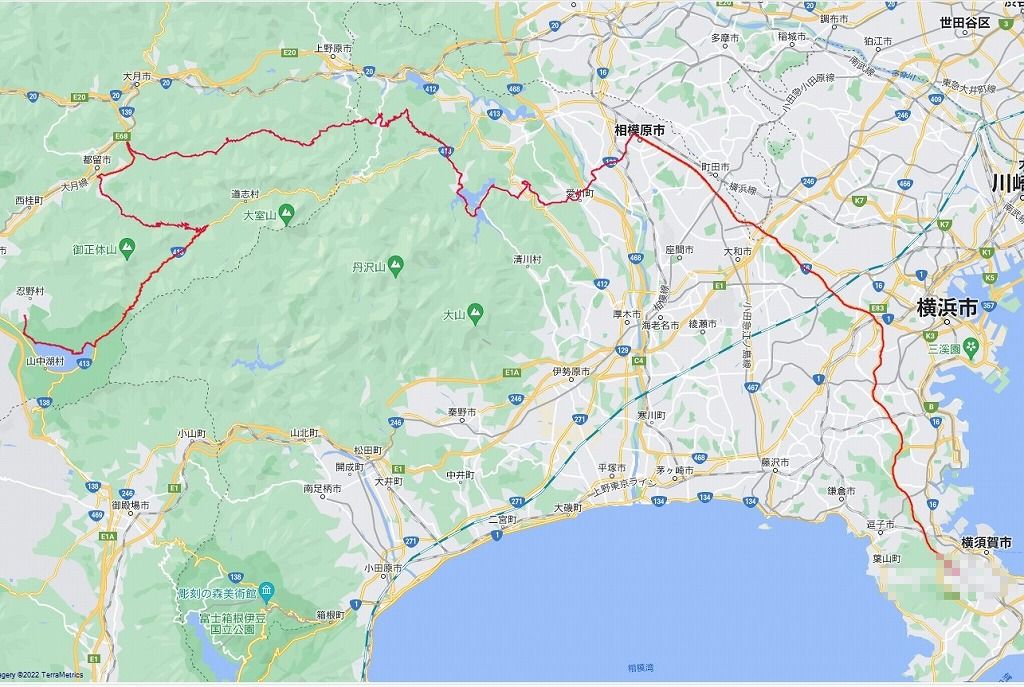 | 忍野〜山中湖〜道志みち〜都留〜県道35号四日市馬上野原線〜宮野木ダム〜相模原市〜自宅まで: 158.7 km |