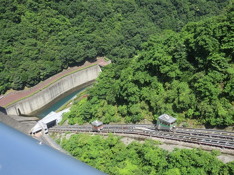 右岸側にあるインクライン(ケーブルカー)ダムの頂上から山麓までを行き来しています。(有料)