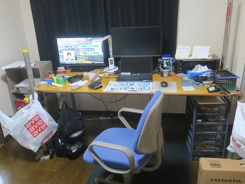 2022年7月30日(土) 7:54 社宅を 足立区の仕事場に移って約2年。 今回、個人的な理由もあって、足立区のアパートを引き払い横須賀の自宅に戻ることにしました。 ここ2年半くらいは covid-19の流行もあり、社会的にテレワークが浸透しました。 今の仕事自体は半分は出張で、足立区の事務所で机に座って仕事しているのは残りの半分くらいです。 その事務仕事も週に1回くらい会社に顔を出せば、後は在宅で処理できそう。 週一の通勤であれば、往復6時間弱かかるのも致し方ないかな。 7月の初旬に仕事先と話をして決めて、アパートを引き払う準備始めました。 写真はアパートの机。 単管を組んで、上にコンパネを引いた簡単なもの。 元々、長居はするつもりはなかったので簡易。 |
