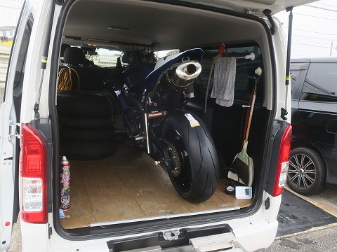 10:51 早々に撤収 左右に駐まっていたクルマも「雨で走れない」ってことで、早々に撤収して居なくなりました。 タイヤウォーマーを外して、雨に濡れないようにハイエースの荷室に置いてあった荷物を一旦外に出して、CBRを積む準備をします。 |