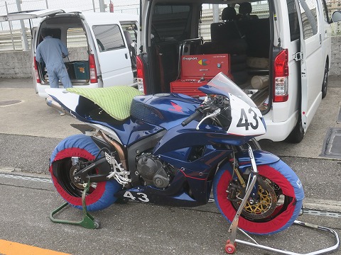 7:58 タイヤを暖める CBRを下ろしたら、まずはタイヤのエアー圧をチェック。 昨日新品に入れ替えているので、エアーの漏れとかが無いのを確認して、エアー圧を調整。 タイヤウォーマーを巻いてタイヤを暖めます。 走行まで1時間ちょっと。 この時期なら、走り始めるまでにタイヤ暖まります。 (個人的な意見?です) |